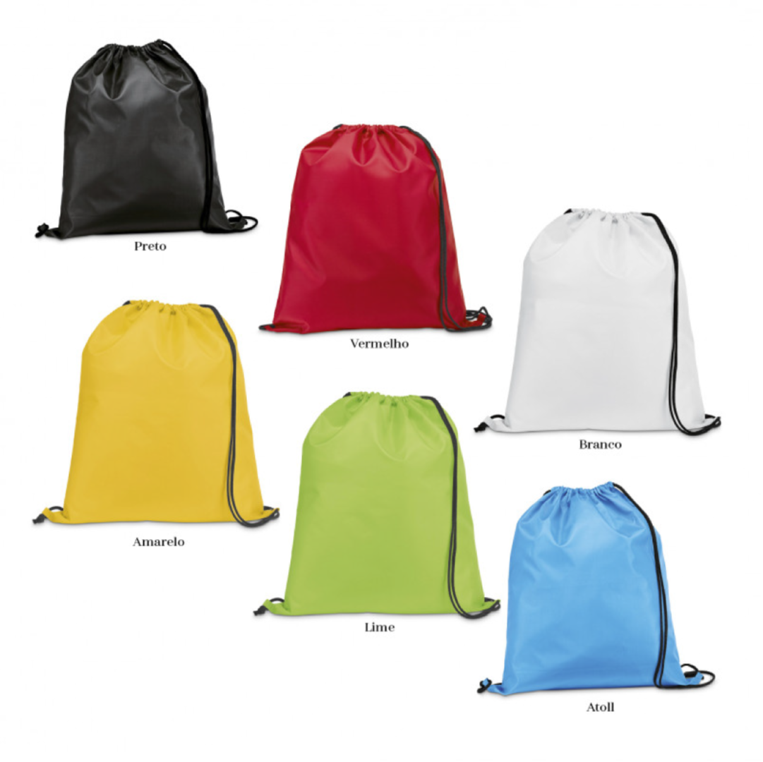 Grande compartimento principal com fecho de cordão. Modelo de cordão para transporte ao ombro ou como mochila. 210DPoliéster. 35cm x 41cm